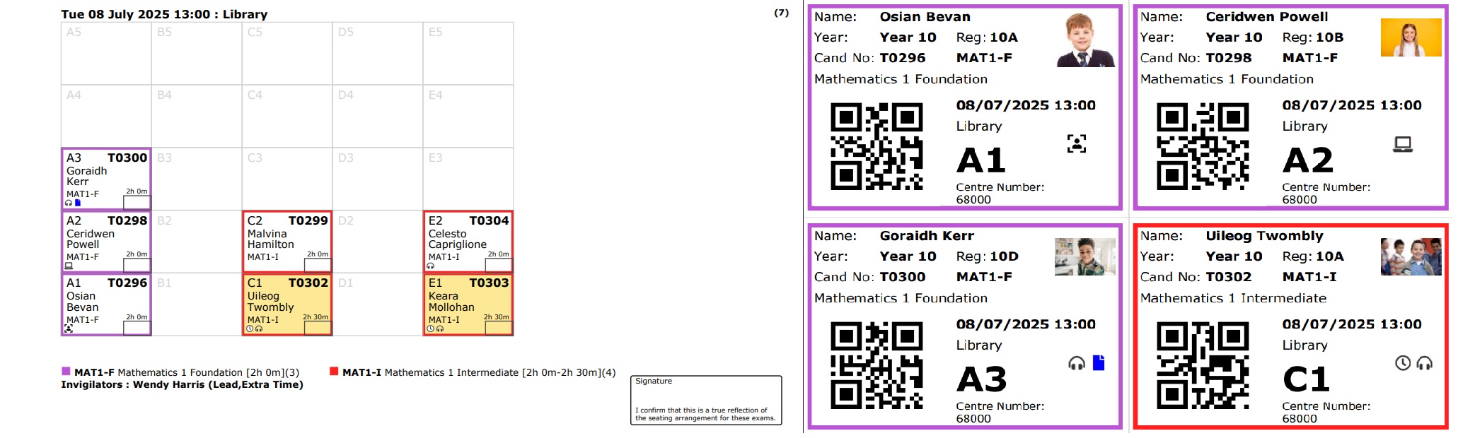 View the candidates 'Access Arrangements' requirements in one location, these are also displayed graphically by using icons. Using icons helps invigilator to see easily what the candidates require i.e. coloured papers, reader, scribe, prompter etc. These icons follow through the whole system and appears on the candidate cards, attendance registers and seating plans created by this system.