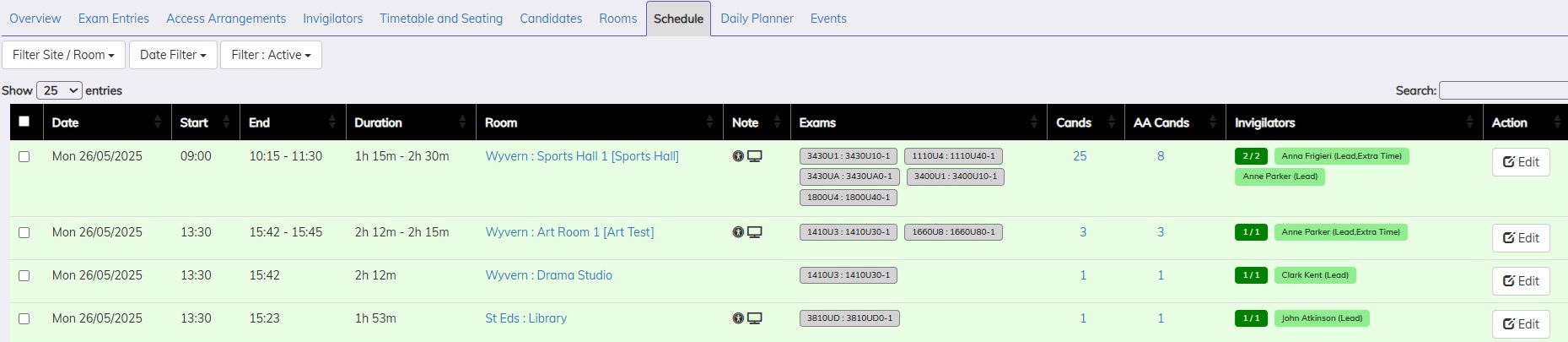 This provides the details of the rooms that an invigilators/staff has been scheduled in. It is also possible to edit the allocated invigilators.